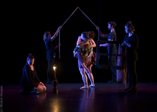 Canon, choreographed by Ronya-Lee LaVaune Anderson, in which Anderson works her way through a stage covered in books; her fellow four performers chuck these books at her from all directions while reading their title or quoting directly from them; Anderson’s movement is powerful and contemporary in nature and she wears a handmade robe over nude underwear.